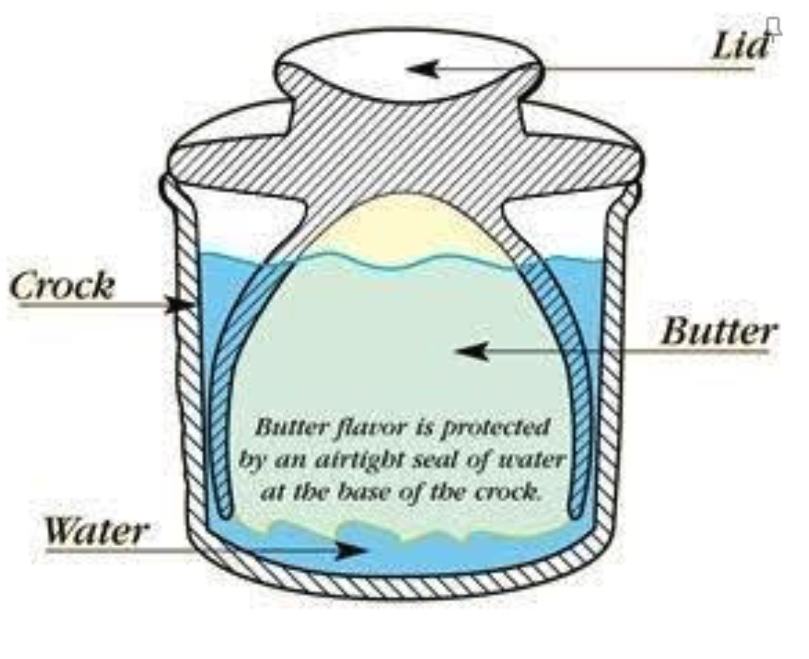 Smørkoppen består av to deler, en kopp med åpningen opp og en mindre kopp som settes med åpningen ned. Den øverste fyller man med smør og setter nedi den andre koppen, som inneholder nok vann til å dekke smøret, slik at luft ikke slipper til. Bildet viser et tverrsnitt av de to delene.